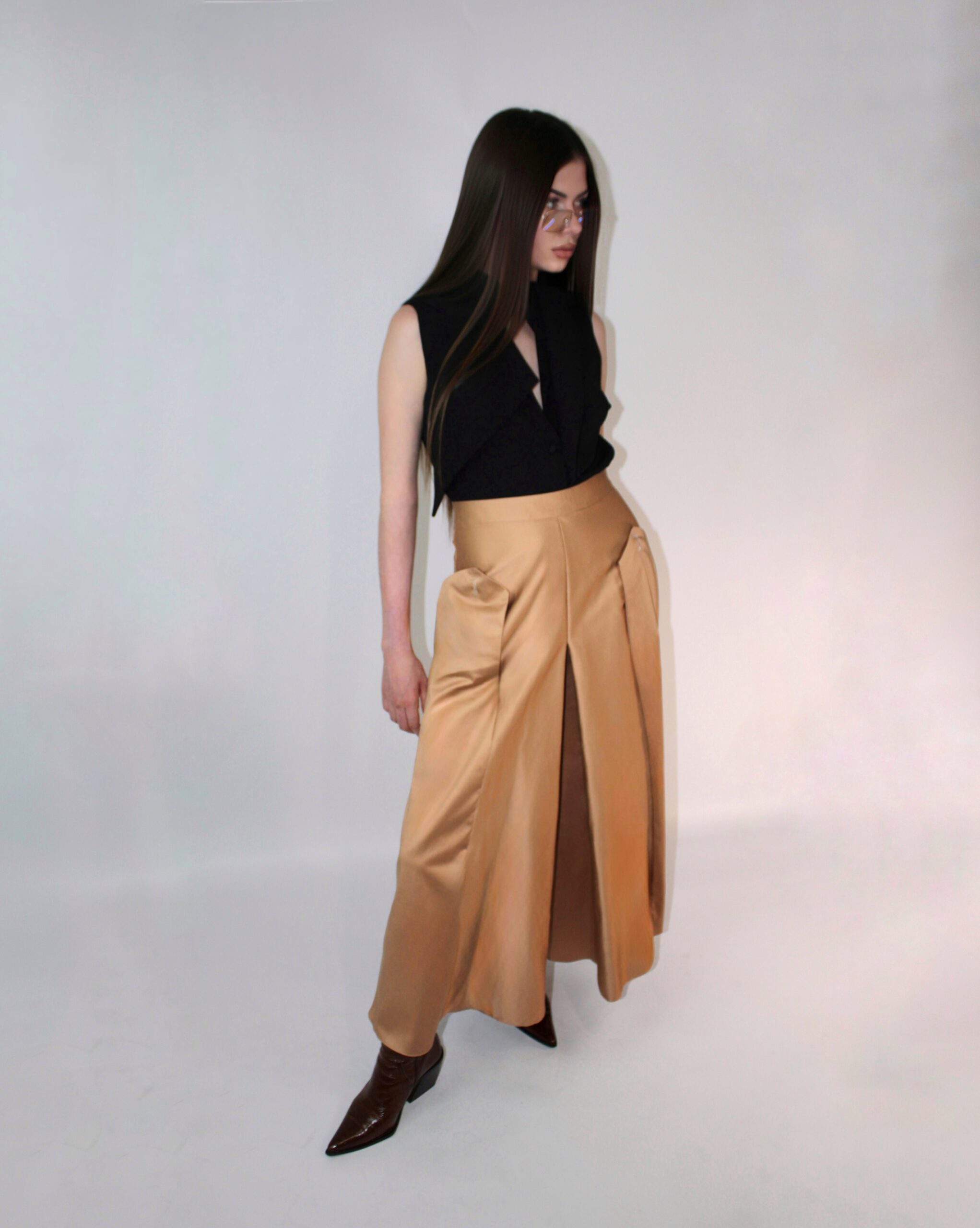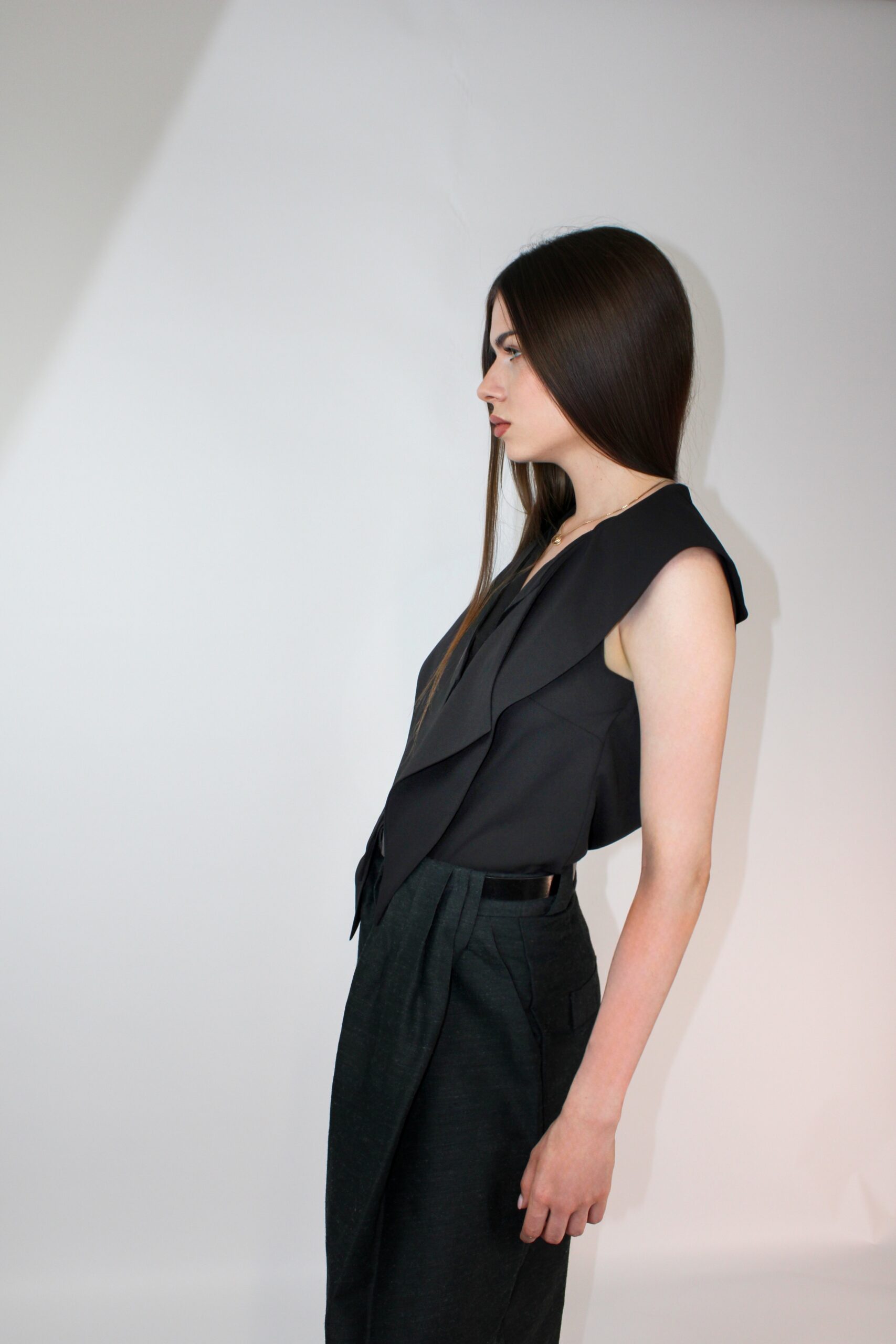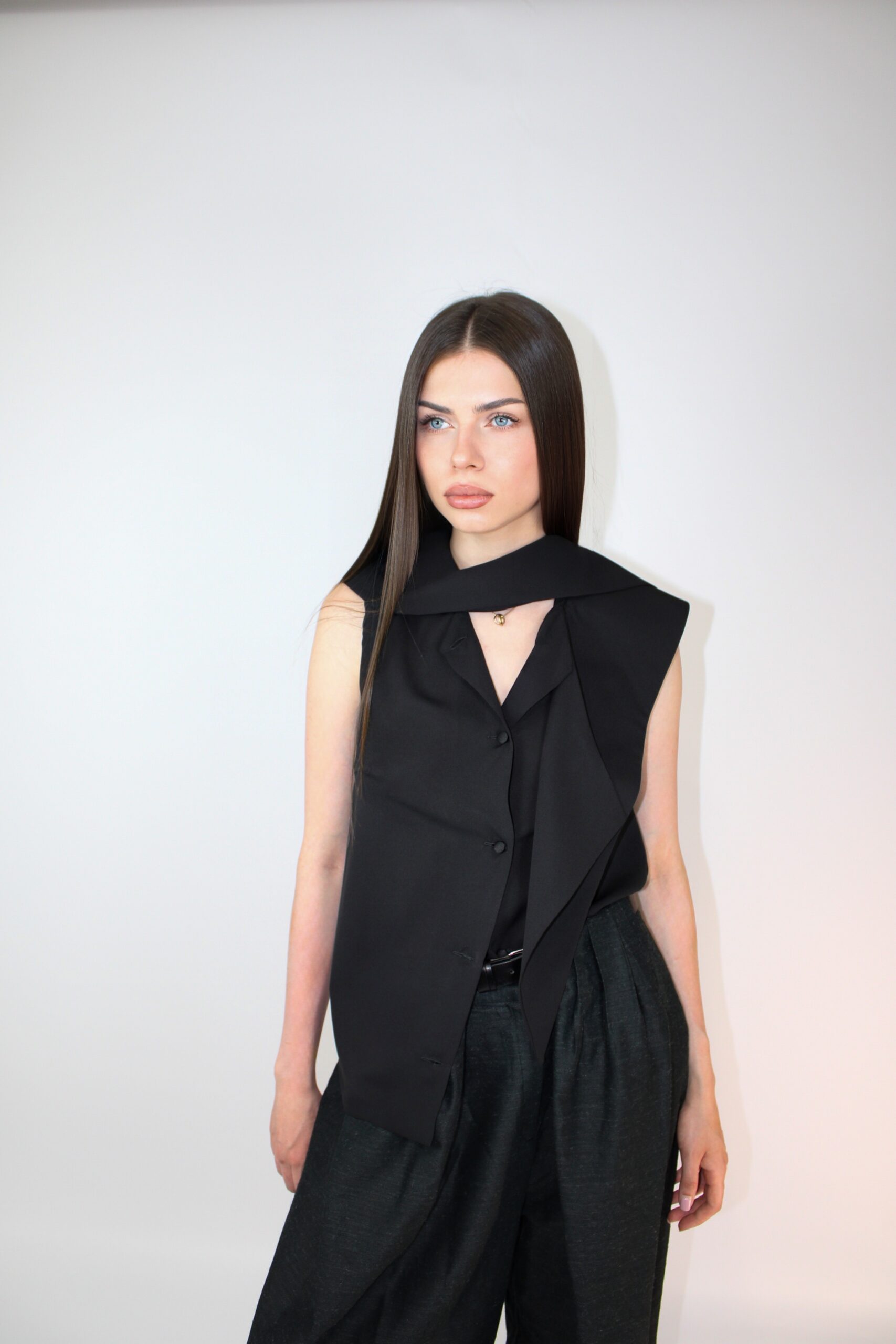 Detaliul definitoriu este gulerul alungit, conceput sa se transforme fara efort: poarta-l cu o fundita eleganta de birou sau lasa-l sa cada lejer in jurul gatului ca pe o esarfa moale si moderna.