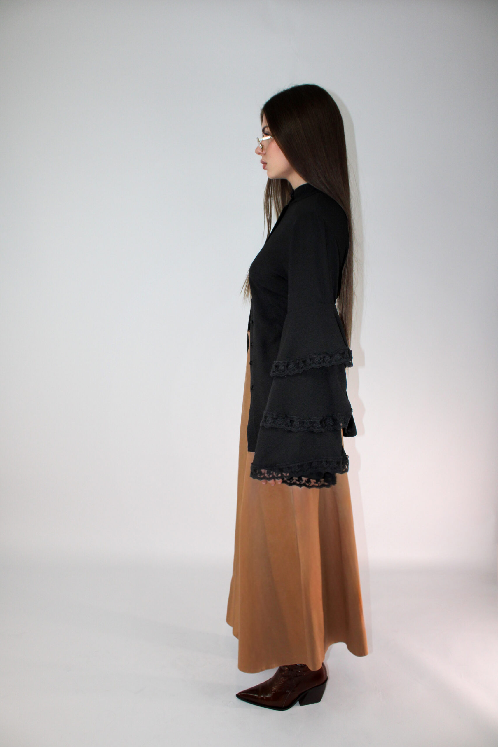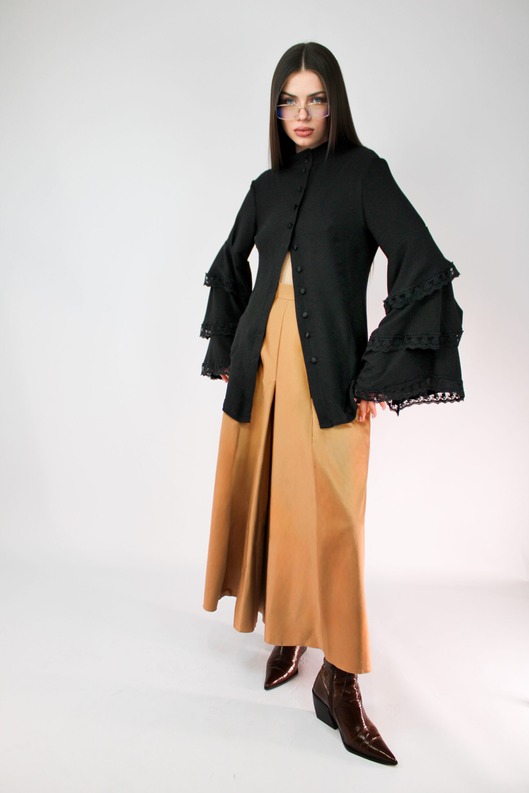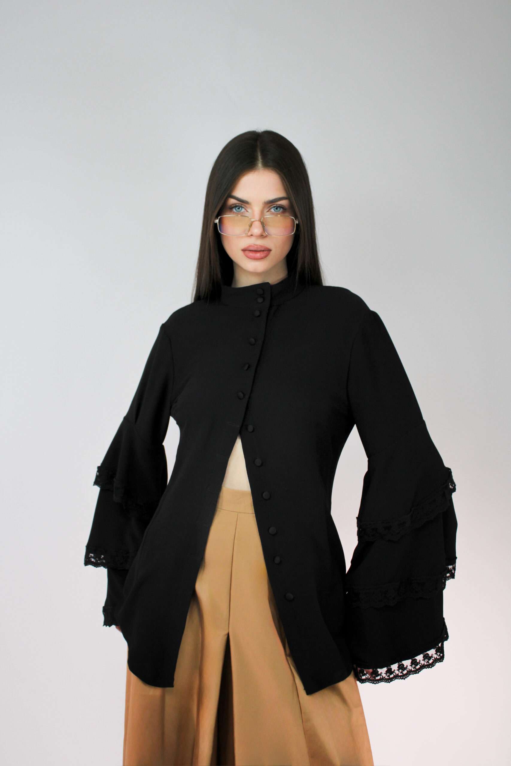 Camasa neagra cu volane triple este o capodopera a designului rafinat si a dramatismului subtil. Lucrata cu maiestrie, aceasta prezinta nasturi negri imbracati complet in material, de sus pana jos, si trei niveluri de maneci evazate in cascada, fiecare impodobita cu sase panouri de dantela cu textura delicata, pentru un finisaj sofisticat si tactil. Elegant structurata, dar extrem de versatila, camasa face trecerea fara efort de la o tinuta de birou impecabila la o piesa statement stilata pentru iesiri casual sau intalniri la cafea. Ca toate piesele noastre atent selectionate, aceasta este conceputa sa fie atemporala si adaptabila la nesfarsit – asorteaz-o, suprapune-o si poart-o in nenumarate moduri creative. Un element esential in garderoba care nu isi pierde niciodata farmecul.