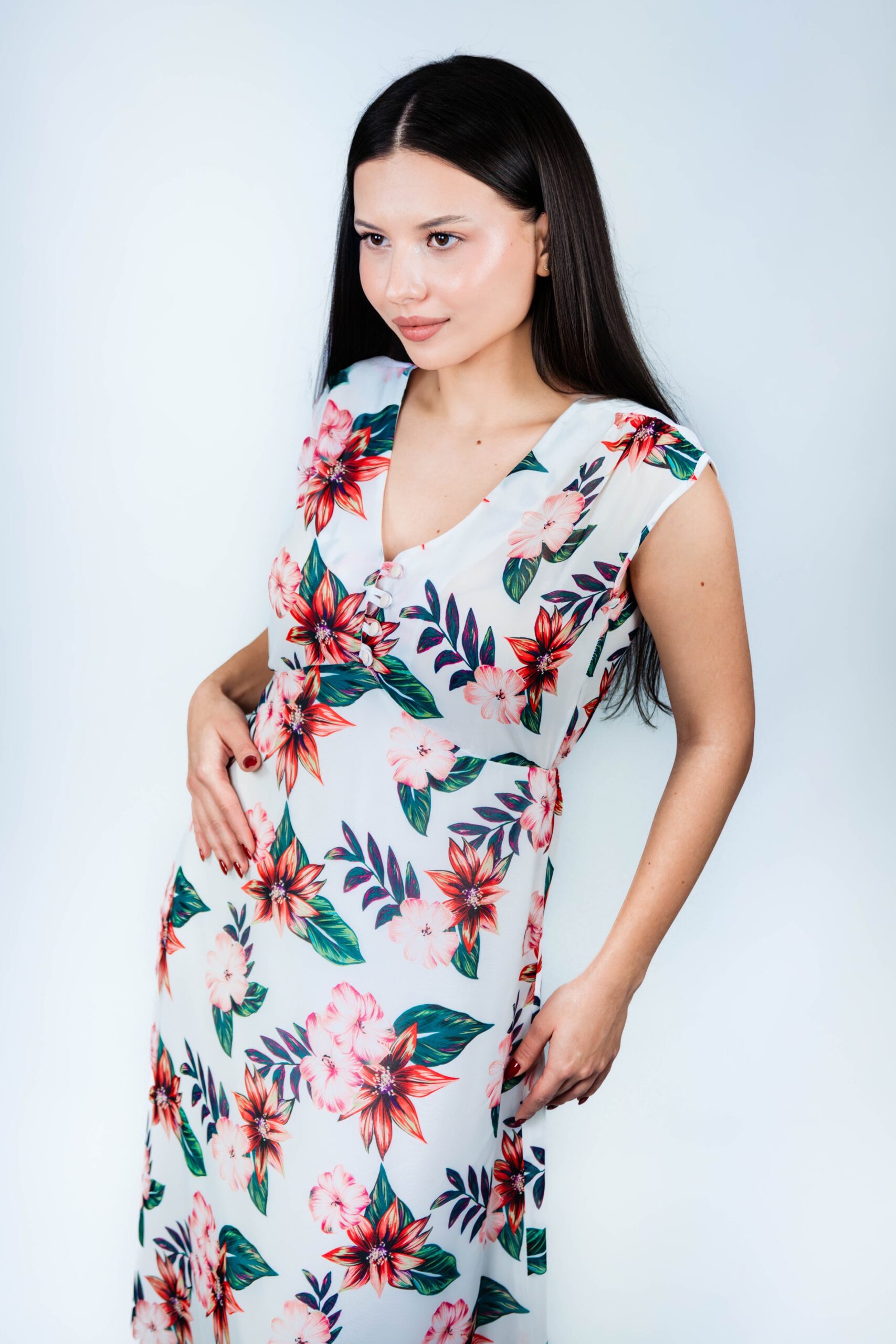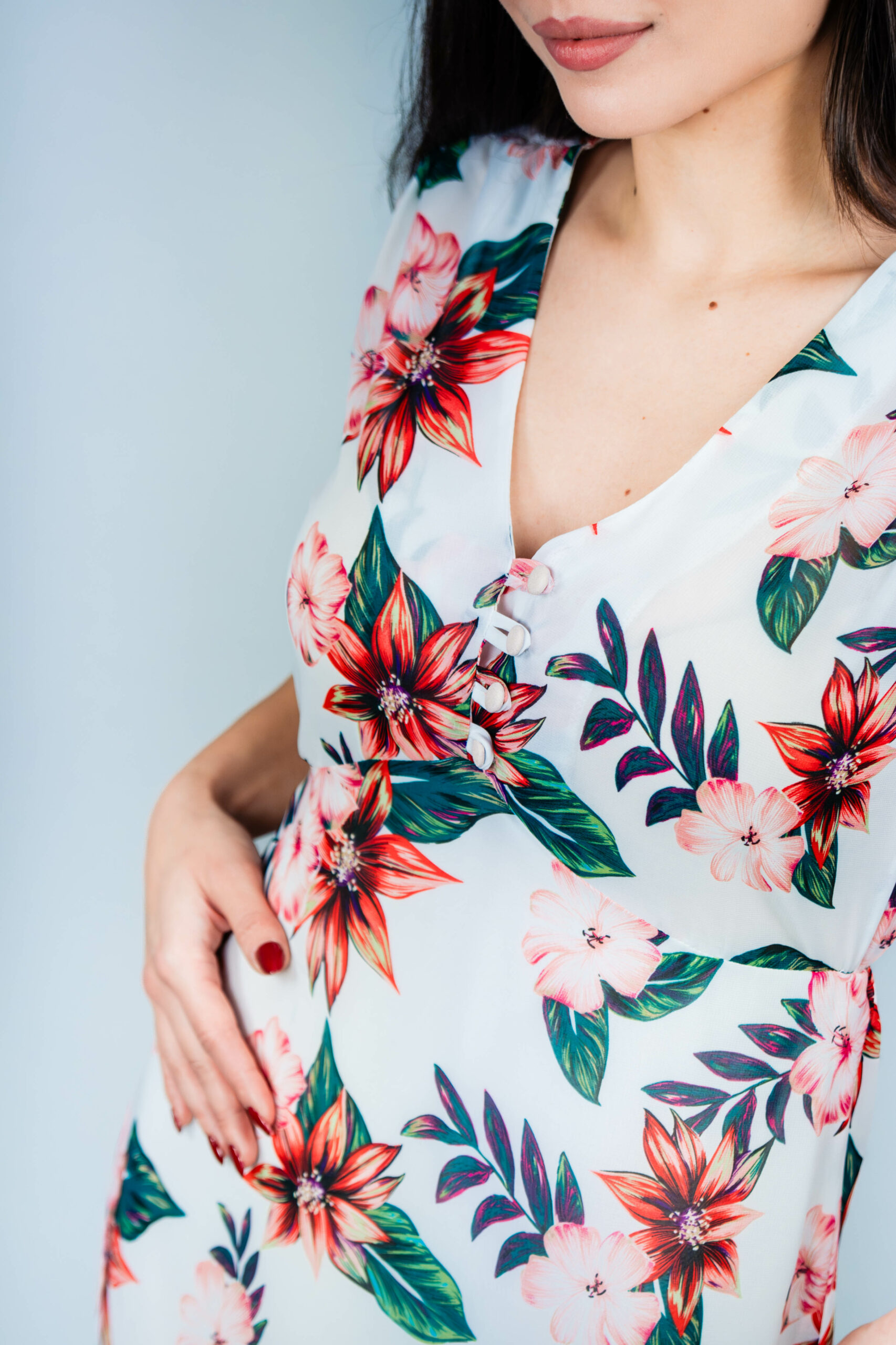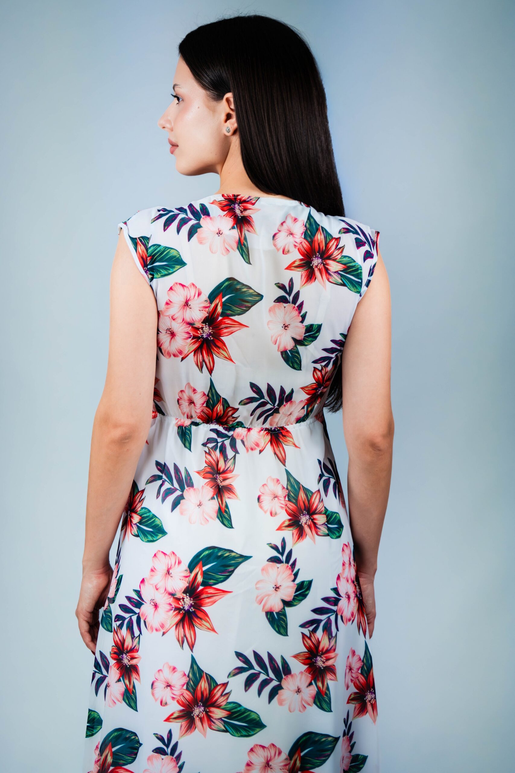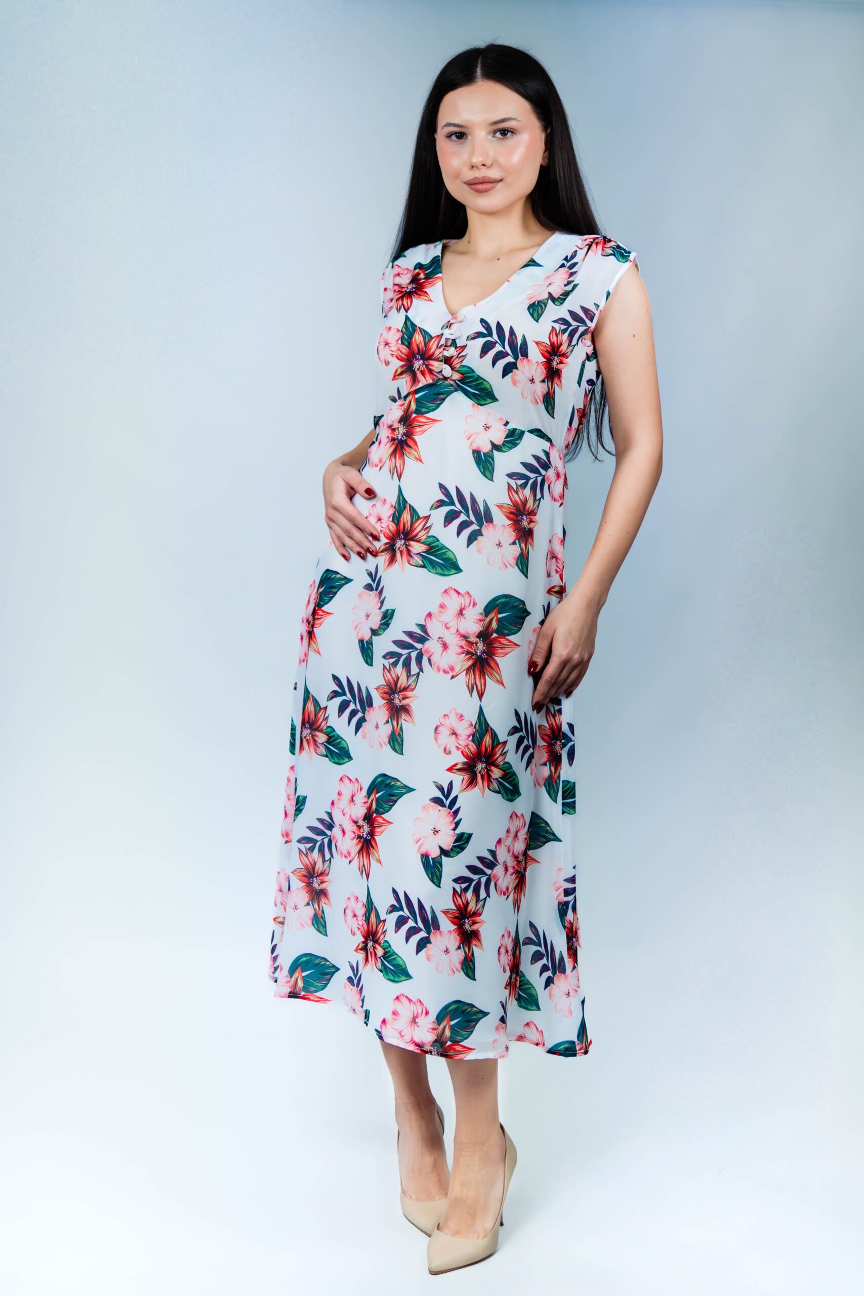 Feminina, romantica si eleganta fara efort, aceasta rochie alba este un vis de vara devenit realitate. Complet decorata cu motive florale rosii vibrante, prezinta un strat semi-transparent cu o captuseala moale pe dedesubt pentru confort si caracter practic. Patru nasturi delicati impodobesc partea din fata, adaugand o nota sezoniera, in timp ce elasticul plasat cu grija la spate contureaza delicat silueta pentru o potrivire feminina si flatanta. Cu o lungime midi, rochia surprinde esenta farmecului estival, fiind alegerea perfecta pentru escapade exotice, petreceri in gradina sau evenimente insorite de zi.