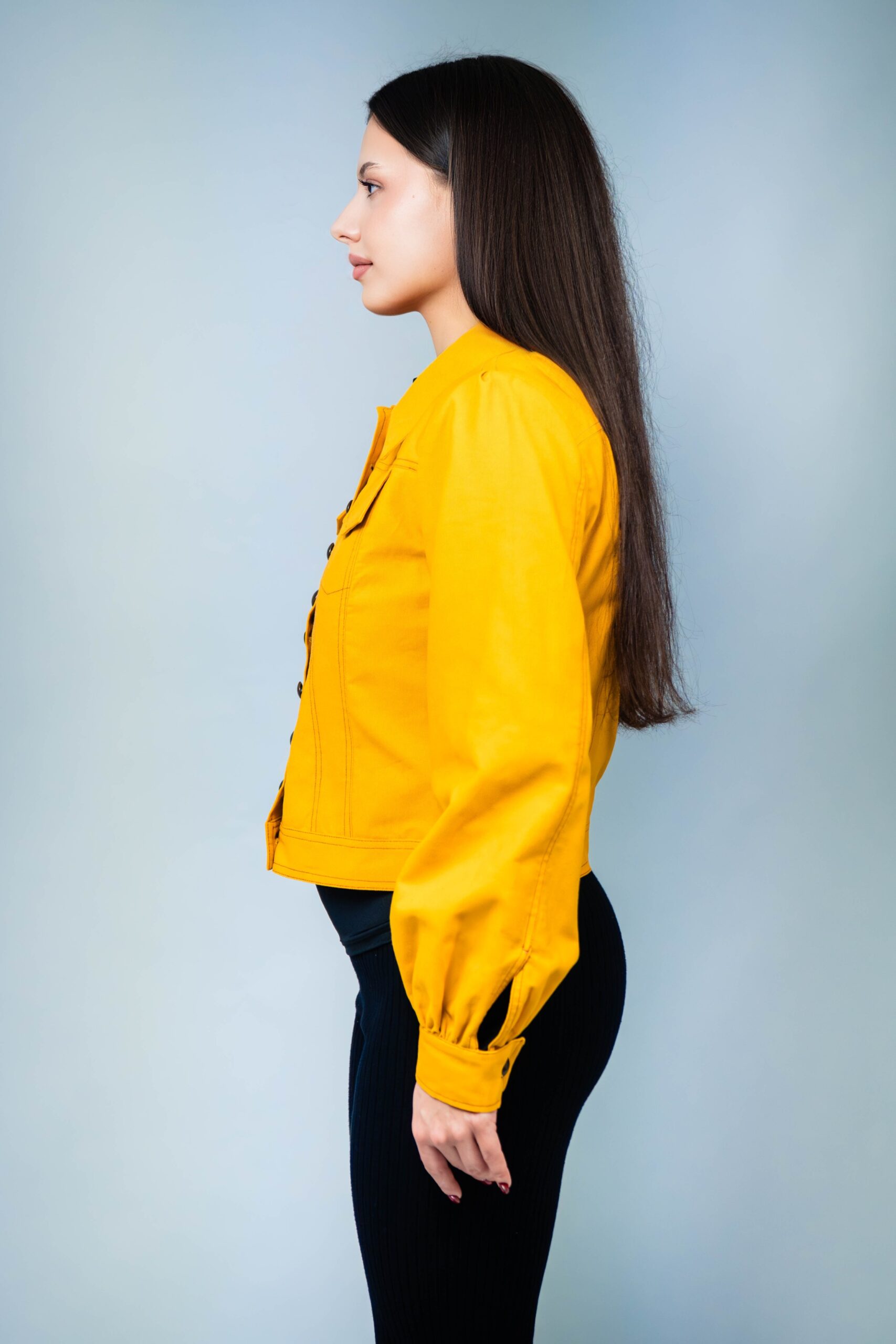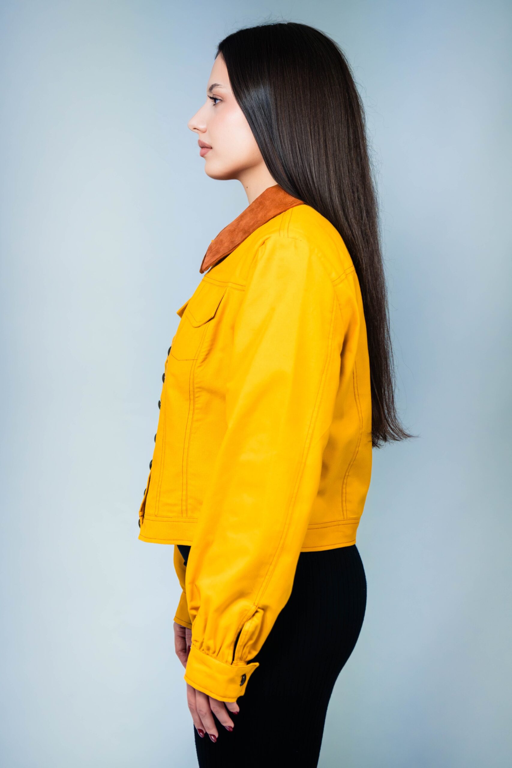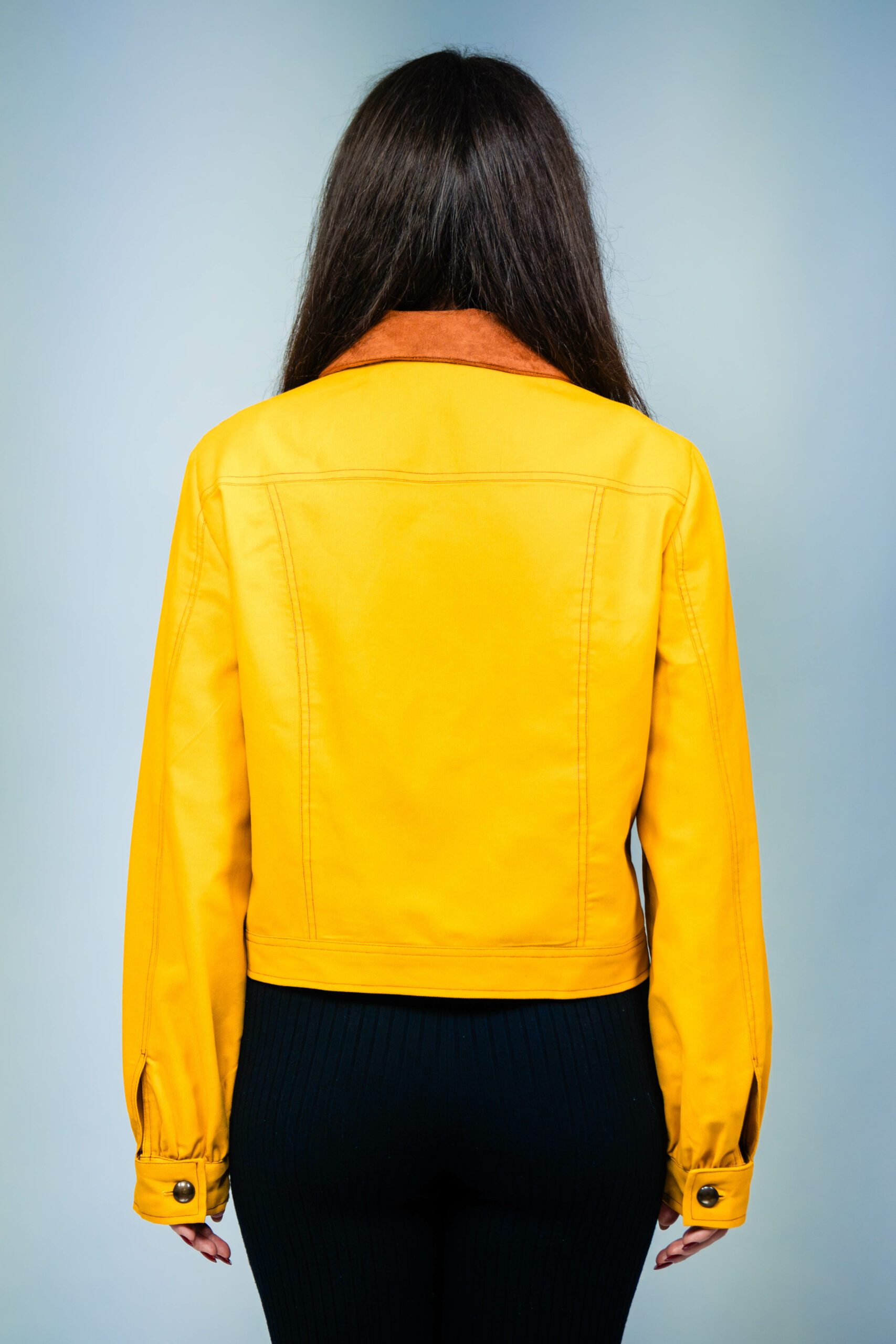 Lucrata manual din bumbac 100%, jacheta are nasturi practici, doua buzunare frontale functionale si un guler moale, cu aspect de piele intoarsa. Avand o culoare galben mustar si maneci incretite, jacheta emana o atmosfera casual.