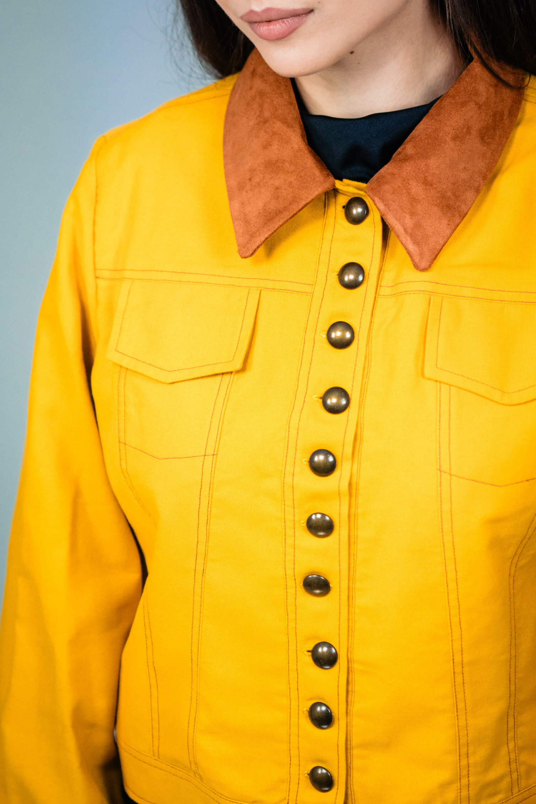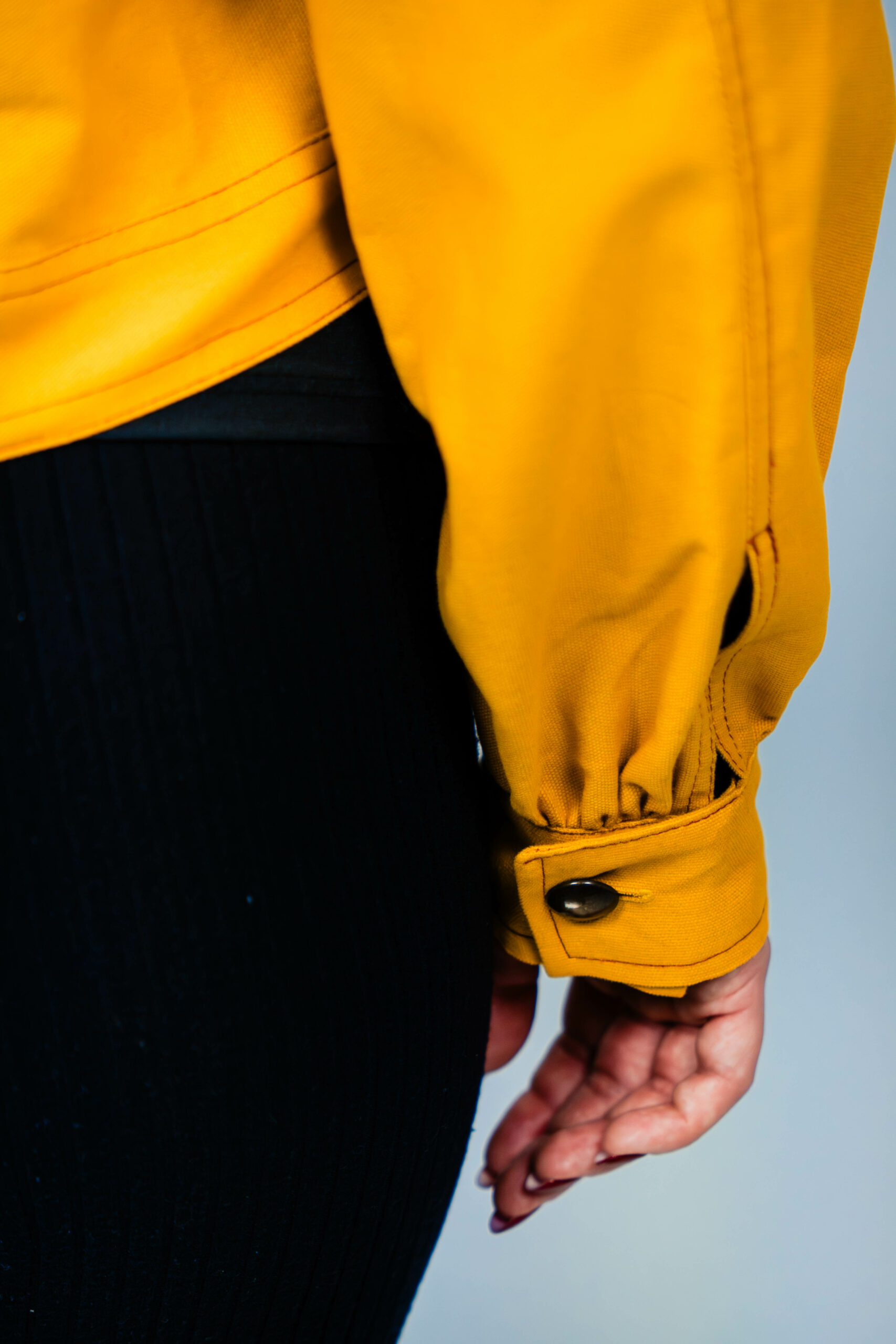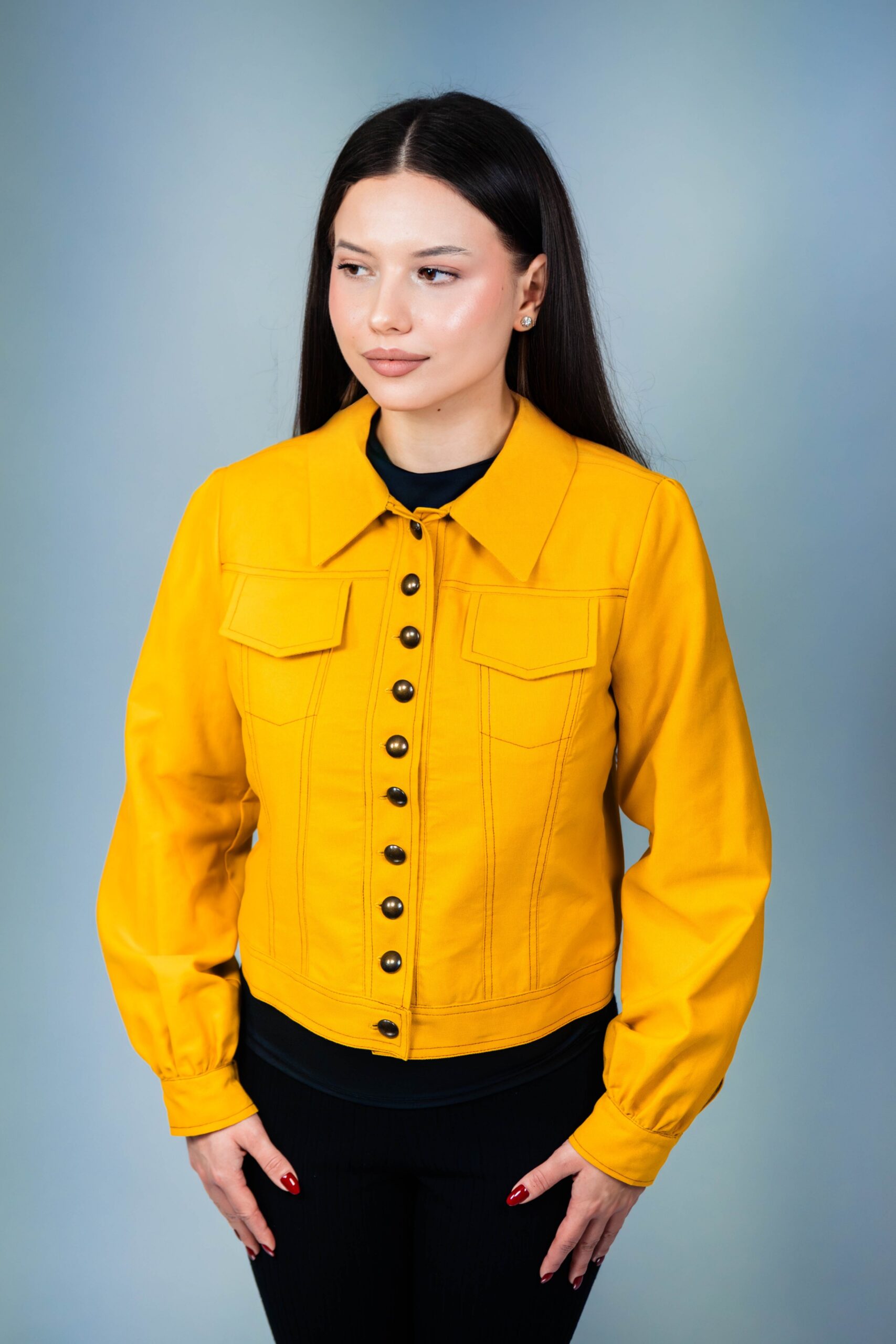 Lucrata manual din bumbac 100%, jacheta are nasturi practici, doua buzunare frontale functionale si un guler moale, cu aspect de piele intoarsa. Avand o culoare galben mustar si maneci incretite, jacheta emana o atmosfera casual.
